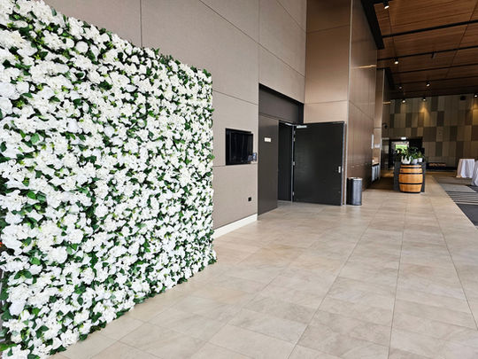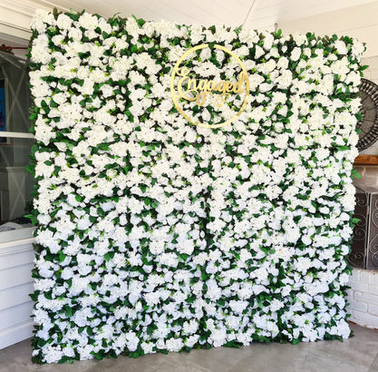 Our Joy flower wall is a luxurious feature background. The white flowers are showcased beautifully between all the greenery, which really makes the white colour pop.